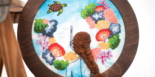 Embroidered art pieces are designed and stitched by hand with ocean themed fabrics. Mixed media paintings and mosaics utilize both texture and color of found materials. Vintage and secondhand materials used in combination with new.
